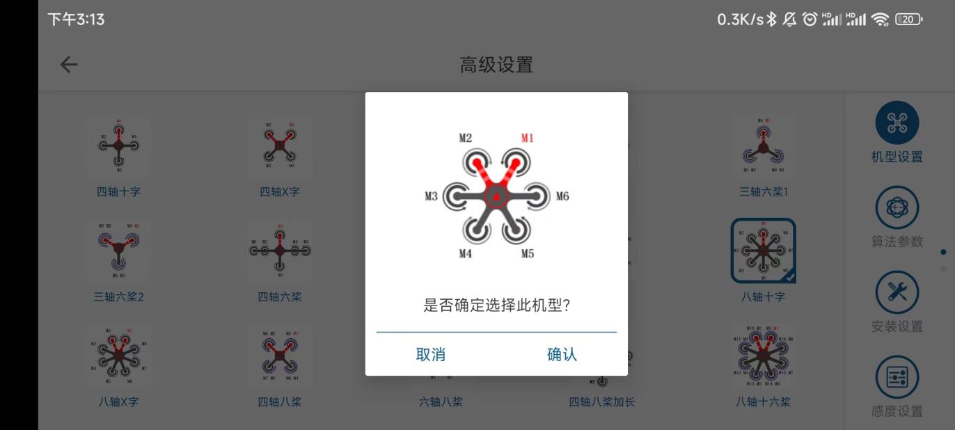设置与飞机匹配的机型类型,注意电机转向及电机序号定义。