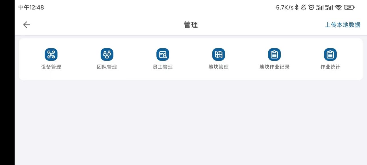 账号主体不同管理中所包含的内容有所不同。管理中包括:设备管理,团队管理,员工管理,地块管理,地块作业记录,作业统计。